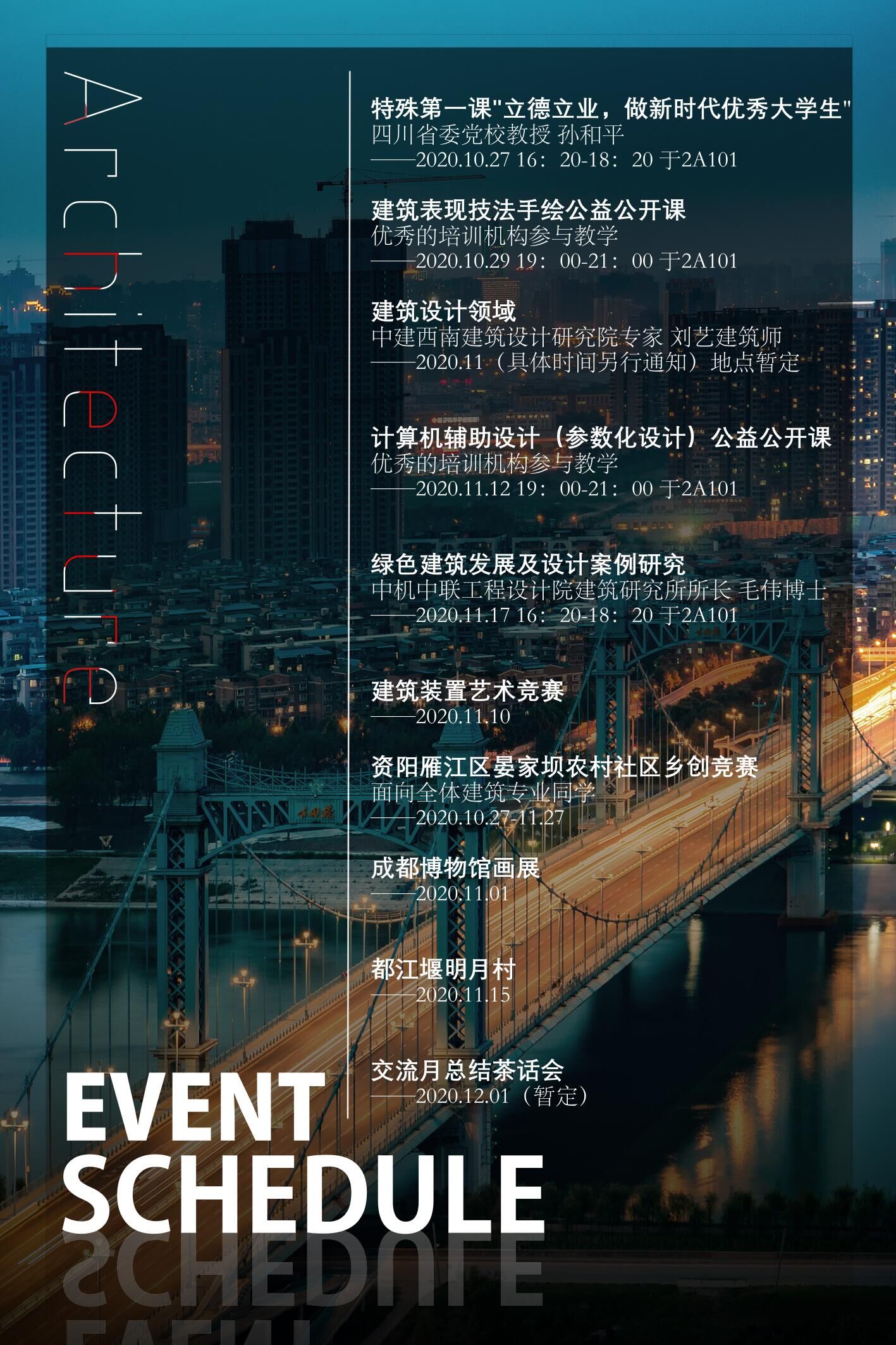 建筑系将在2020年10月27日至11月27日开展“建筑交流月”活动,该活动将从专家讲座,参观实践,专业竞赛三方面进行。